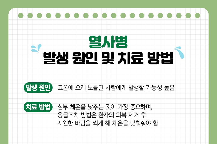 열사병은 심부 체온이 40도가 넘어가면서 체온 조절 중추가 기능을 못해 몸 속의 열을 발산하지 못하는 질환입니다. 초기에는 땀이 많이 나고, 고열, 의식 변화, 발작, 환각, 혼수 등을 보입니다. 하지만 증상이 심해지면 체액량 부족과 땀샘 기능 이상으로 땀이 나지 않는 무발한 상태가 됩니다. 열사병 증상이 오래 지속되면 여러 장기가 손상되면서 뇌부종, 급성신부전 등의 발생과 쇼크를 일으킬 수 있으며 사망에 이를 수도 있습니다. 땀이 식었다고 증세가 완화된 것이 절대 아니니, 증세가 나타나면 바로 병원에 가서 치료받길 바랍니다.