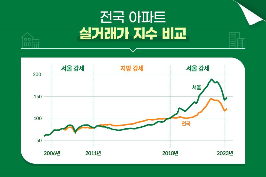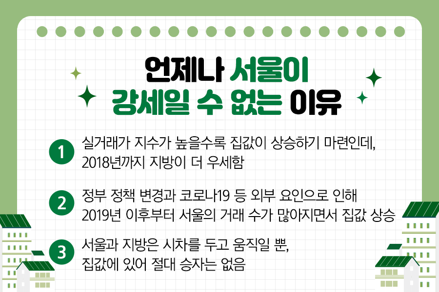 수도권과 지방은 시차를 두고 움직이기 때문에 타이밍만 존재할 뿐, 절대 승자는 없습니다. 집값의 움직임을 잘 읽어야 하죠.