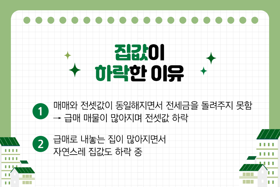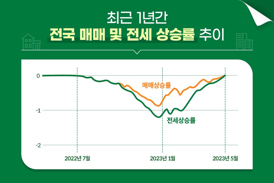 먼저 최근 부동산 시장을 살펴보면, 2022년 하반기 집값이 하락하기 시작했습니다. 전문가들은 그 이유를 2015년부터 2021년까지 급등한 집값의 피로감으로 인해 떨어지게 된 거라 예상했는데요. 금리의 영향도 있었습니다. 작년 하반기부터 금리가 가파르게 오르면서 전세 대출 이자 부담으로 전세 수요가 월세로 전환되자, 버팀목 역할을 하던 전셋값이 떨어진 거죠. 그러면서 집값도 함께 하락하게 되었습니다.