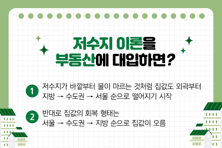 이러한 현상을 ‘저수지 이론’이라 부릅니다. 저수지에 비가 오지 않으면 외곽부터 물이 마르며 수위가 낮아지다가, 가뭄이 지속되면 마지막까지 남아있던 중심지도 물이 말라 버리죠. 반대로 비가 오면 중심지부터 물이 차기 시작해 점점 외곽으로 물이 차 올라가는데요. 집값 흐름도 동일합니다. 저수지처럼 집값이 하락하면 외곽지역부터 먼저 떨어지고, 하락세가 지속되면 결국 중심지도 떨어지는 거죠. 반대로 집값이 회복할 때는 중심지부터 먼저 상승을 한 뒤 서서히 외곽지역으로 상승세가 확산됩니다.