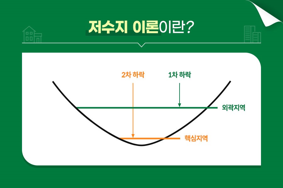 이러한 현상을 ‘저수지 이론’이라 부릅니다. 저수지에 비가 오지 않으면 외곽부터 물이 마르며 수위가 낮아지다가, 가뭄이 지속되면 마지막까지 남아있던 중심지도 물이 말라 버리죠. 반대로 비가 오면 중심지부터 물이 차기 시작해 점점 외곽으로 물이 차 올라가는데요. 집값 흐름도 동일합니다. 저수지처럼 집값이 하락하면 외곽지역부터 먼저 떨어지고, 하락세가 지속되면 결국 중심지도 떨어지는 거죠. 반대로 집값이 회복할 때는 중심지부터 먼저 상승을 한 뒤 서서히 외곽지역으로 상승세가 확산됩니다.