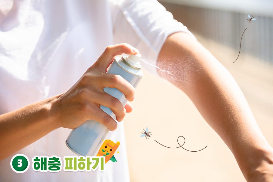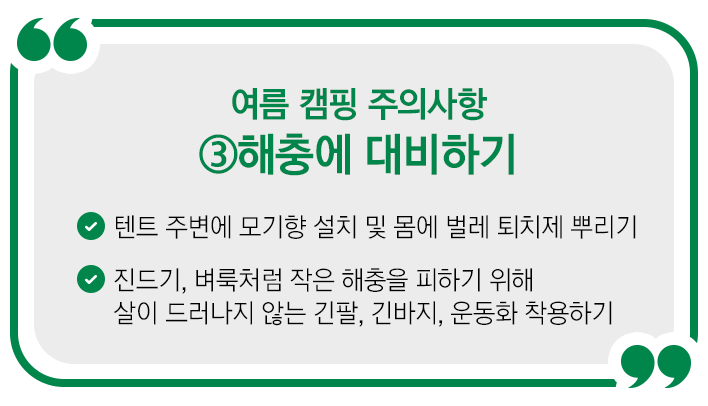 캠핑 장소가 숲속에 위치한 경우가 많기 때문에 해충에 유의해 주셔야 합니다. 모기향을 텐트 주변에 설치하여 벌레가 오지 못하도록 막아주는 것도 좋아요. 직접적으로 몸에 해충이 달라붙지 못하도록 벌레 퇴치제를 뿌리는 것도 추천합니다.