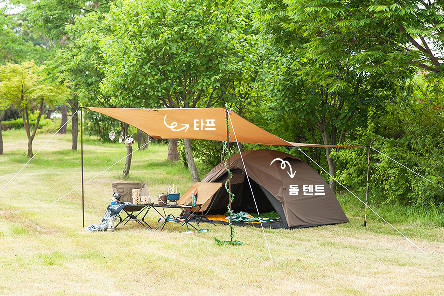 요즘 캠핑러들이 많아지면서 거실과 취침 공간이 따로 나뉘어져 있는 리빙쉘 텐트를 많이 이용하는데요. 리빙쉘 텐트엔 타프가 포함돼 있어, 타프를 따로 들고 갈 필요가 없습니다. 하지만 무더운 여름엔 부피가 큰 리빙쉘 텐트를 설치하고 철수하기 정말 번거롭죠. 그러니 여름엔 리빙쉘 텐트보단 돔 텐트 위에 타프를 설치하는 형식으로 가볍게 캠핑을 떠나도 좋겠네요.