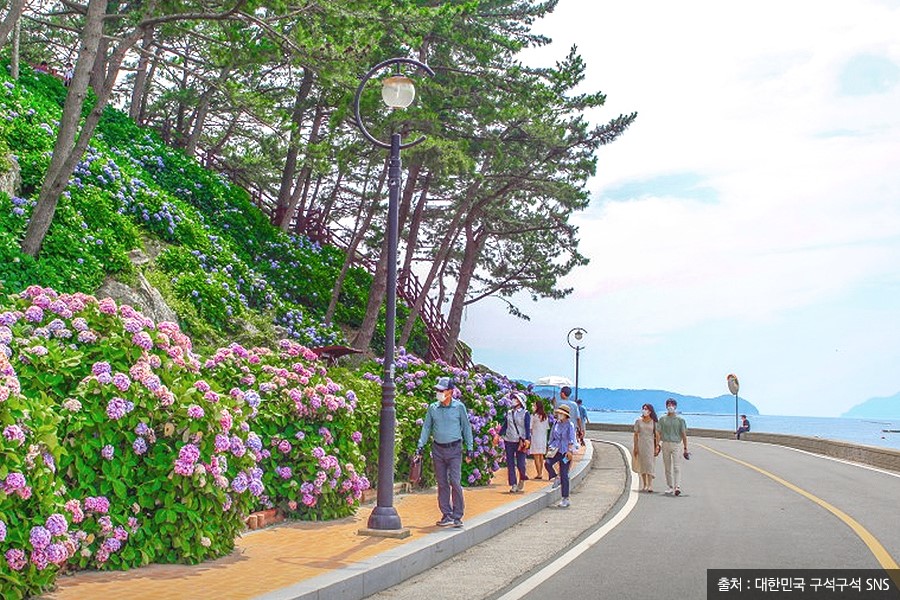 이곳의 명소는 바로 해안도로라고 해도 과언이 아닙니다. 해안 도로를 따라 펼쳐진 수국은 말 그대로 장관을 이룹니다. 바다와 수국을 한눈에 담을 수 있어, 드라이브 명소로도 꼽히죠:) 시원한 바다와 알록달록한 수국을 모두 즐기고 싶다면 저구마을로 떠나보세요!