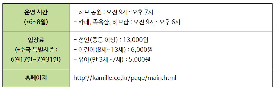 이곳의 6~7월은 단연 수국이 가장 돋보이는데요:) 푸른 숲과 형형색색의 수국은 마치 유럽 정원을 연상케 합니다. 어디를 가나 포토스팟이 되는 팜카밀레 허브정원! 수국 정원은 여름에만 한정으로 볼 수 있으니, 꼭 여름이 가기 전 방문하세요!