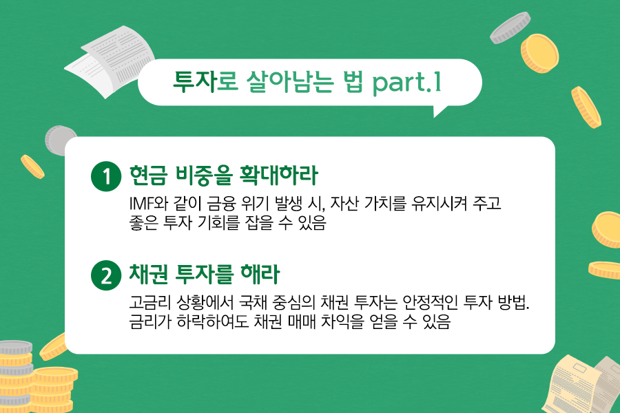그럼 이러한 경제 위기에서 투자에 성공하는 방법은 무엇일까요? 단기적인 측면에서 취할 수 있는 투자 방안과 장기적인 측면에서 고려해야 할 내용, 두 가지를 얘기해 보려고 합니다. 단기적인 측면에서는 현금 비중 확대와 채권 투자를 적절한 대처방안으로 생각할 수 있습니다.