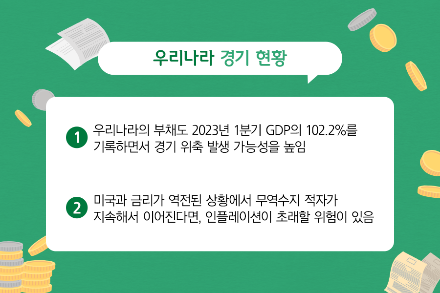 우리나라의 경제 상황도 만만치 않습니다. IMF와 OECD가 가장 문제로 제기하는 것이 우리나라의 가계 부채 증가입니다. 국제금융협회의 발표에 의하면 한국 가계의 부채는 2023년 1분기 GDP의 102.2%를 기록하고 있고, 이는 조사국 중 가장 높은 수준입니다. 가계 부채가 심각한 상황에 금리도 상승하면서 가계 소비 여력이 급격하게 떨어지고 있어, 경기 위축 발생 가능성이 커졌습니다. 경기 위축과 고금리가 만나 가계 부채 문제가 현실화하고, 금융권들에 영향을 미치면 한국 경제는 심각한 상황이 될 수도 있습니다.