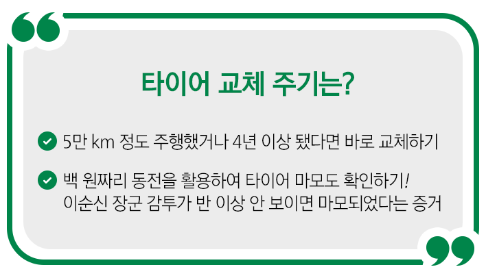 타이어 교체 주기를 지켜주는 것도 정말 중요합니다! 마모된 상태에서 운전하는 것은 정말 위험한 행동입니다. 여름철엔 달궈진 도로가 타이어와의 마찰을 계속해서 증가시켜 파열 위험성을 더 높이기 때문인데요. 마모된 타이어는 이미 비정상적인 상태이므로, 공기압 주입으로 해결되지 않습니다. 교체가 답이죠. 타이어의 마모도를 정확히 알고 싶다면, 백 원짜리 동전을 홈에 넣어 보세요. 이순신 장군의 감투가 반 이상 보인다면 마모가 되었단 증거이니, 바로 교체해 주셔야 합니다.
