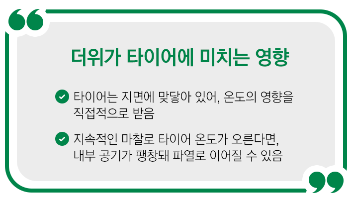 대기 기온이 30도가 넘을 때 아스팔트의 온도는 60도까지 치솟는 경우가 많습니다. 이렇게 지면의 온도가 높이 올라가면, 지속적으로 지면과 마찰을 일으키는 타이어의 온도도 상승하죠. 그럼 타이어에 열이 축적되면서 내부 공기가 팽창하게 되는데요. 심하면 내부 압력이 점차 높아지면서 파열로 이어질 수 있답니다.