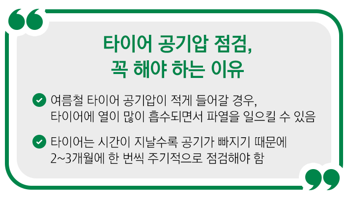 여름철 타이어 파열을 막을 수 있는 가장 똘똘한 방법은 무엇이 있을까요? 바로 타이어 공기압 점검입니다. 공기압 점검만 잘 해줘도 타이어 파열의 위험에서 벗어날 수 있는데요. 타이어 공기압에 따라 자동차 제동 능력이 좌지우지되기 때문이죠. 타이어에 공기압이 과하게 들어가 있으면, 바퀴 중앙 부분만 지면에 노출돼 노면 충격 흡수력이 약해지게 됩니다. 그럼 타이어가 빠져 큰 사고로 이어질 수 있답니다.