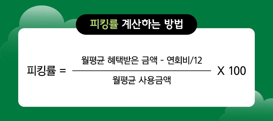 먼저, 신용카드 피킹률을 높이는 것이 좋습니다. 신용카드 피킹률이란 신용카드를 사용함으로써 얻는 혜택을 해당 카드의 전체 사용 금액으로 나눈 비율입니다. 즉, 카드를 얼마나 잘 사용하고 있는지 판단할 수 있는 지표입니다. 피킹률을 구하는 공식은 아래와 같습니다.