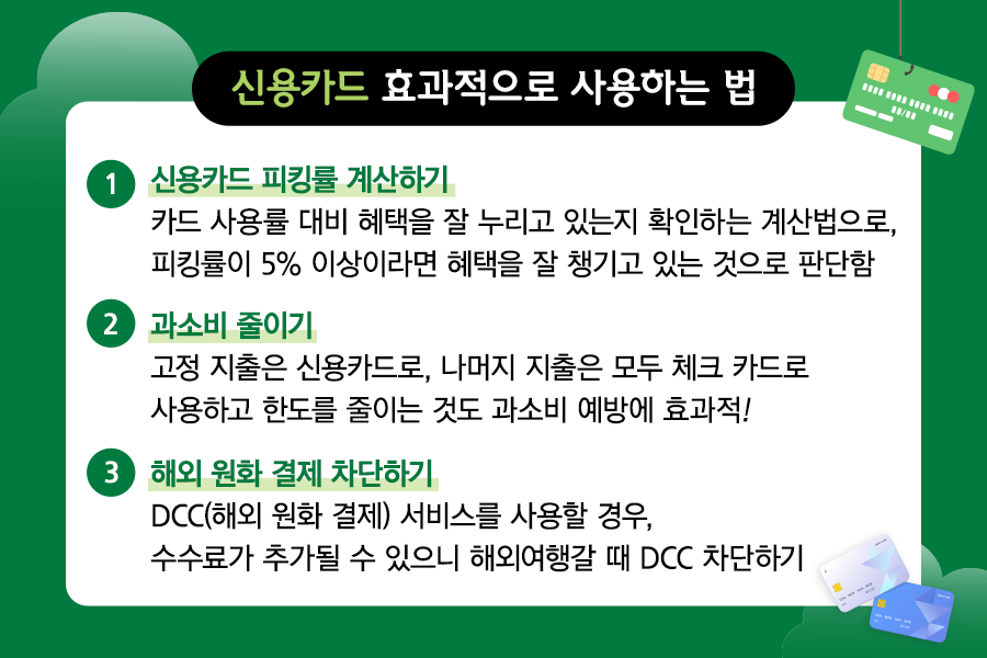 ‘신용카드를 잘라버려야 한다’고 외치는 많은 전문가의 주장은 이 편리함이 만들어 내는 후유증이 생각보다 크기 때문입니다. 신용카드 똘똘하게 사용하는 방법 중 가장 좋은 방법은 ‘사용하지 않기’일 수도 있습니다. 하지만 신용카드 미사용이 생각보다 쉽죠. 그러니 신용카드를 알뜰하게 사용하고 싶다면, 피킹률은 높이고 고정지출 위주로 사용해 주세요. 그럼 효과적으로 신용카드를 이용할 수 있게 될 겁니다.