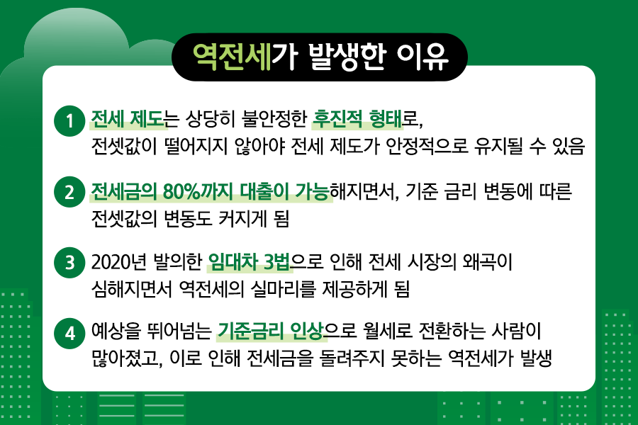 전셋값은 대규모 입주 물량이 쏟아질 때가 아니면 잘 떨어지지 않습니다. 그런데 2022년 하반기에는 금리가 올랐다는 이유만으로 속절없이 떨어졌죠. 왜 그런 걸까요? 그 이유는 네 가지로 정리할 수 있습니다.