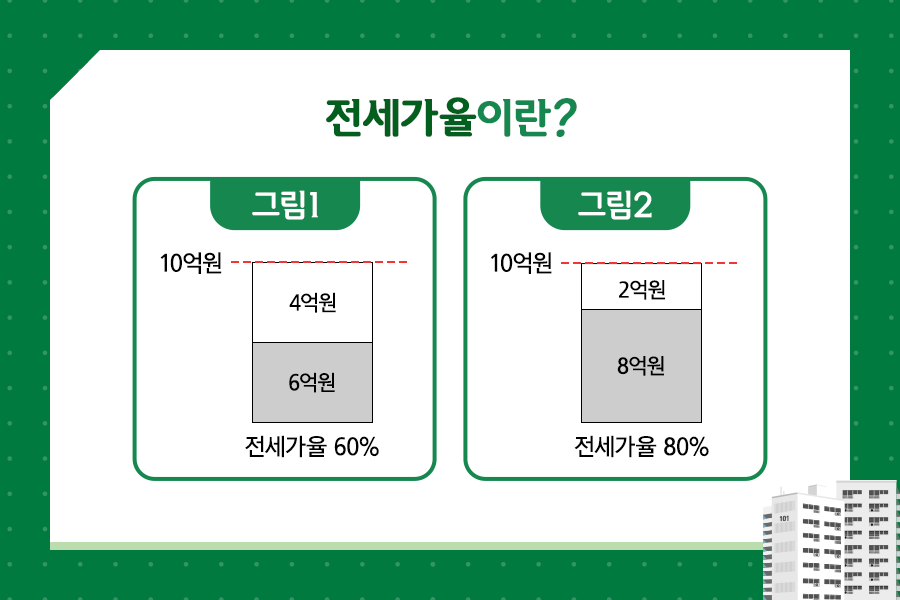 매매가 10억 원의 집이 있다고 가정했을 경우, 그림 1의 전셋값은 6억 원으로 전세가율은 60%입니다. 여기에 자본 4억 원을 투자하면 10억 원 집의 주인이 될 수 있지요. 그림 2의 전셋값은 8억 원으로 전세가율은 80%입니다. 자본 2억 원을 투자하면 10억 원 집주인이 될 수 있죠. 이 중 합리적인 투자는 그림 2입니다. 즉, 전세가율이 높을수록 갭 투자 효율은 높아지고, 본인에게 득이 될 수 있습니다.