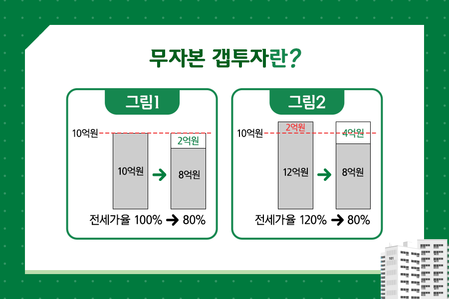 영원히 이렇게만 되면 이보다 손 쉬운 투자가 어디 있겠습니까? 하지만 이런 부푼 꿈을 가지고 많은 집을 구입했다가 그림1과 같이 전셋값이 8억 원으로 떨어져 전세가율이 80%가 되면, 한 채당 2억 원 빚이 생기게 되죠. 그림2의 경우엔 한 채당 4억 원의 빚이 생기게 됩니다. 이런 무자본 갭 투자는 서울 아파트보다 저렴한 빌라, 오피스텔 혹은 지방 일부 소형아파트에서 많이 발생합니다. 그저 투자라는 명목 하에 제대로 알아보지 않고 무자본 갭 투자를 한다면, 전 재산이나 다름없는 전세금을 받지 못하는 세입자 가족의 인생을 망가트리는 사회적인 문제가 될 수 있답니다.