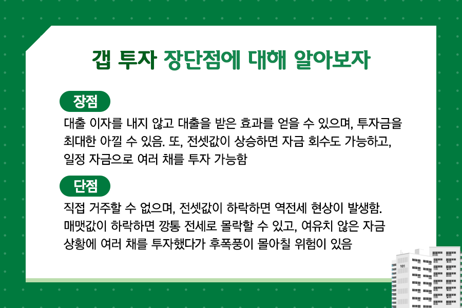 반대로 탐욕에 눈이 멀어 본인이 감당하지도 못할 수십 수십채의 주택을 갭 투자하는 것은 본인뿐만 아니라 세입자의 가정도 파괴하는 범죄가 될 수 있습니다. 사회의 한 구성원으로서 본인의 욕심으로 다른 사람이 피해볼 수 있는 것을 꼭 생각하여 합법적이고 건전한 부동산 투자를 하시길 바랍니다.