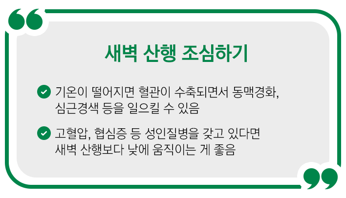 산 정상에 오르기 위해 새벽부터 산에 가는 분도 많이 계시죠하지만 고혈압협심증심근경색 같은 질환을 갖고 있는 분이라면 새벽 산행은 꼭 피해야 합니다그 이유는 기온 때문인데요기온이 떨어지면 신체는 외부로 빠져나가는 열을 막기 위해 혈관을 수축시킵니다그럼 혈압이 상승하고 혈압과 심장 박동은 급격히 빨라지면서 동맥경화가 발병할 수 있고더 나아가 심근경색증을 포함한 급성 심장발작까지 일으킬 수 있습니다.