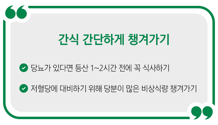 만약 당뇨가 있다면등산 1~2시간 전에는 꼭 식사를 하고 산에 오르길 바랍니다. 빈속에 등산을 하면 저혈당 상태에서 격한 운동을 하게 되는 것과 마찬가지이므로 정신을 잃을 수 있습니다. 그러니, 꼭 식사 후 산행에 나서야 하고요. 인슐린을 투여한다면, 식사 후와 동일하게 투여 후 1~2시간이 지나고 등산하시길 바랍니다. 또, 언제든 찾아오는 저혈당에 대비하기 위해 자가혈당측정계도도 꼭 챙겨주시고요! 사탕초콜릿음료수와 같은 당분이 많은 비상식량을 준비해 가는 것도 좋습니다.