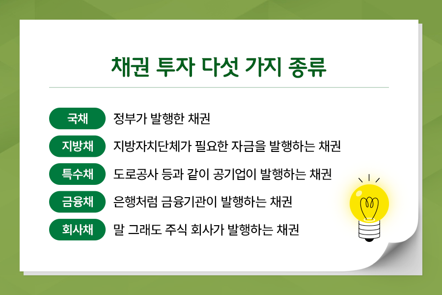 채권의 종류는 다양하게 분류할 수 있는데, 채권의 종류를 발행 주체별로 나누어 보면 국채, 지방채, 특수채, 금융채, 회사채, 이렇게 다섯 가지로 나누어 볼 수 있습니다.