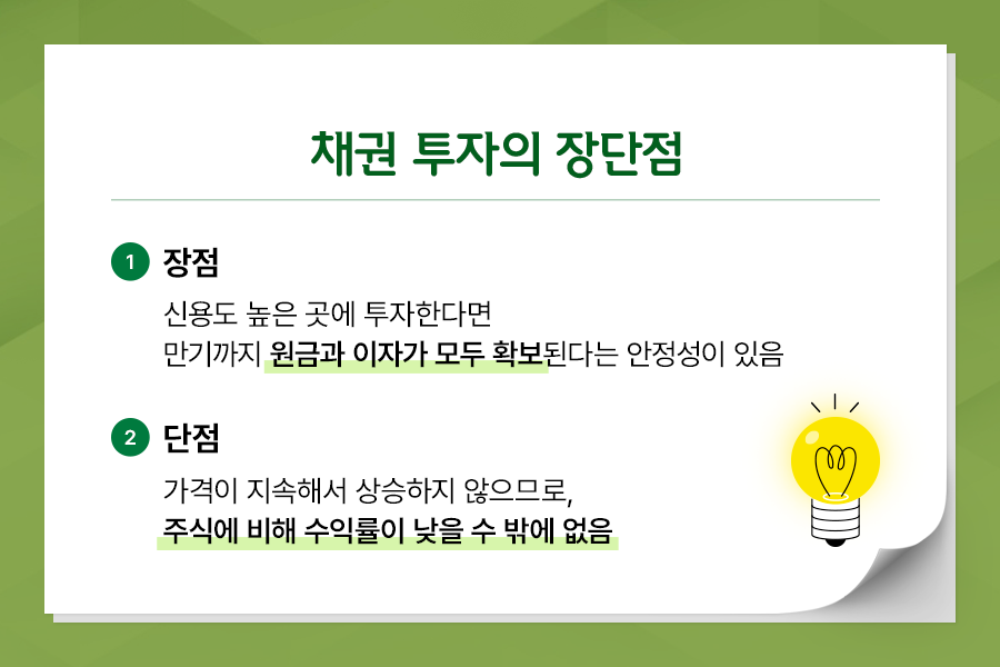 정리를 해보면, 채권 투자는 만기에는 확정된 원금과 이자를 받을 수 있으니까 주식보다는 안전하다고 할 수 있습니다. 보유하고 있는 동안 금리가 하락하면 채권 가격이 오르기 때문에 매도해서 수익을 얻을 수 있기 때문에 투자하게 되는 거죠.