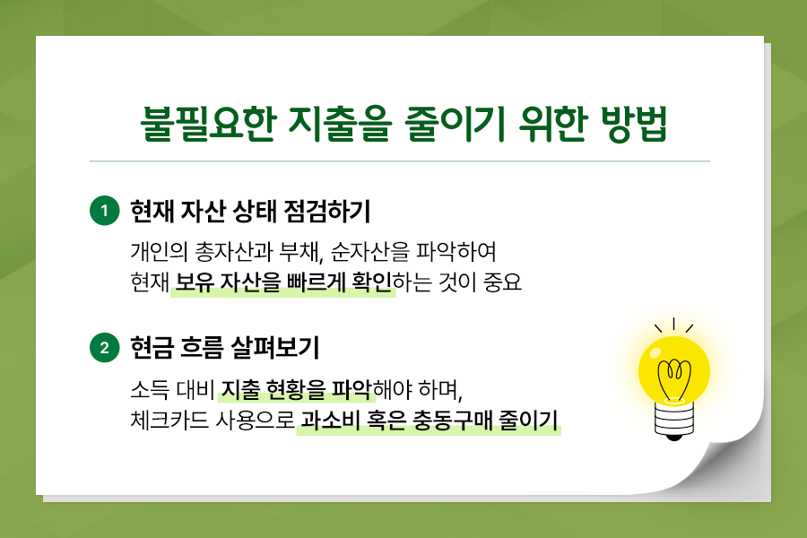 지출 부담을 최대한 줄이기 위해선 현금흐름표를 통해 현재의 수입원을 파악하고, 고정지출과 변동지출을 체크해서 소득 대비 지출이 더 많은지 검토하는 것도 중요합니다. 일상생활에서 할 수 있는 방법부터 차차 해나가는 게 중요한데요. 먼저, 생활비 부담을 줄이기 위해 대형 할인점이나 백화점보다 동네 가까운 마트를 활용하는 것이 좋겠습니다. 당연히 대형 할인점이나 백화점 물건이 고급스럽고 할인도 많이 해주지만, 그만큼 충동구매로 이어질 가능성이 높기 때문에 필요한 경우에만 구입하는 동네 마트를 추천합니다. 또, 대출을 받은 게 있다면 고금리 우선순으로 대출을 상환하는 게 좋고요. 신용카드의 경우 너무 무이자 할부를 활용하지 말고, 가급적 체크카드나 현금결제를 하시길 바랍니다. 기존에 가입한 보험의 보장분석을 통해 불필요한 보험료 지출을 줄여야 합니다. 과거에 가입한 실손의료비보험의 경우 갱신마다 보험료 상승 폭이 높기 때문에 가급적 4세대 실손의료비보험으로 갈아타서 보험료 부담을 낮추는 것이 좋습니다.