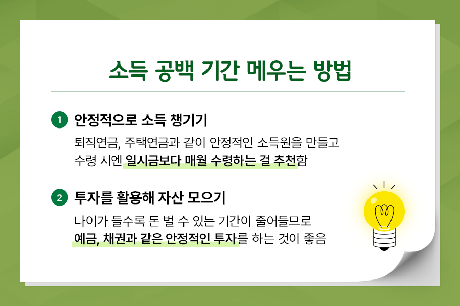 목돈이 있다면 즉시 연금이나 국공채 등 채권투자를 통해 안정적인 소득원을 만드세요. 가입한 퇴직연금이나 연금저축, IRP는 조기 수령이 가능한지 꼭 검토하세요. 그래야 은퇴하는 시기와 연금을 받는 시기가 맞물려 소득 공백이 크게 벌어지지 않을 수 있습니다. 또, 연금을 수령 받을 땐 일시금보단 매월 수령하는 방법이 좋습니다. 일시금으로 받는다면 세금을 내야 하는데요. 높은 금액을 한 번에 받기 때문에 세금이 꽤 많이 나갈 수 있기 때문이지요. 만약 목돈은 없지만, 보유한 주택이 있다면 자기 소유의 주택을 대상으로 연금을 받을 수 있는 주택연금을 신청하는 것도 매월 생활비 마련할 수 있는 좋은 방법입니다.