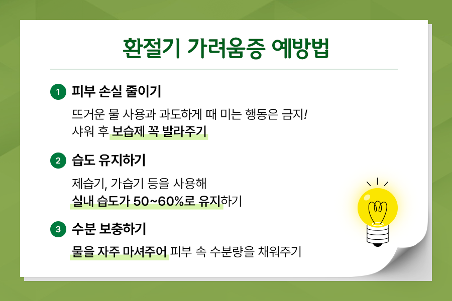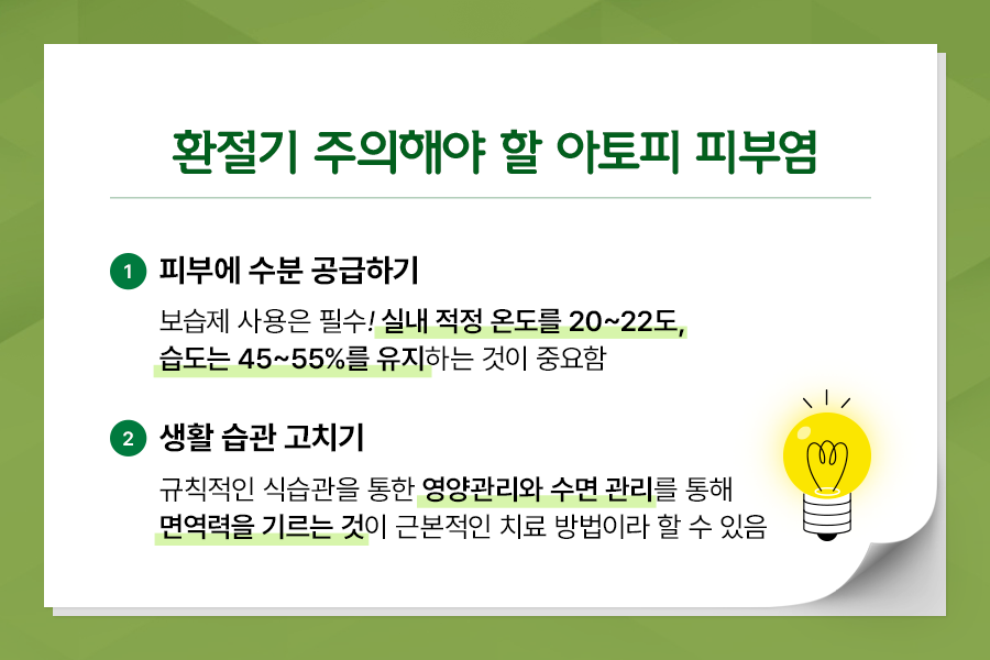 아토피 피부염이 있다면 일교차가 심한 환절기에 더욱 주의가 필요한데요. 아토피 피부염은 발병 원인은 정확하진 않지만 유전적, 환경적 요인과 피부 장벽의 기능 이상 및 면역학적 문제 등으로 추정됩니다. 이 밖에도 온도 및 습도의 변화, 스트레스, 식품 알레르기 등은 증상 악화 요인입니다. 그러므로 아토피 피부염 환자는 환절기의 건조한 날씨와 외부 자극 혹은 알레르기 유발 물질, 스트레스로 인해 가려움증이 심해져 증상이 악화될 수 있습니다. 특히 밤에 가려움증이 심해지며, 가려워서 긁게 되면 피부 습진이 더욱 심해져 다시 더 심한 가려움이 유발되는 악순환이 반복될 수 있습니다.