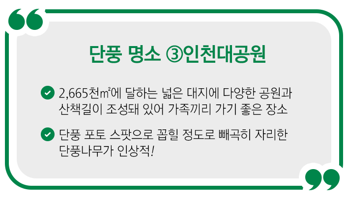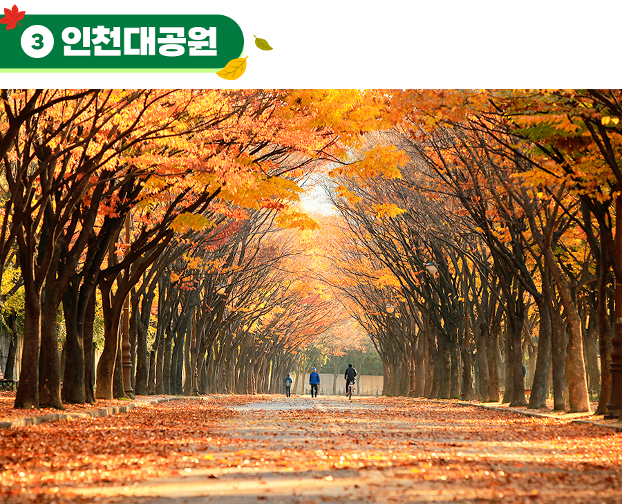 서울에 한강공원이 있다면, 인천엔 인천대공원이 있죠:) 그 정도로 인천공원하면 가장 먼저 떠오르는 유명한 공원인데요! 2,665천㎡에 달하는 넓은 대지에 호수정원을 중심으로 장미정원, 조각정원, 수목원, 메타세콰이어길 등 다양한 공원과 산책길이 조성돼 있습니다. 보고 즐길 거리가 풍부한 이곳에 가을에 꼭 가야 하는 이유가 있는데요. 바로 단풍나무 길 때문이지요:-)