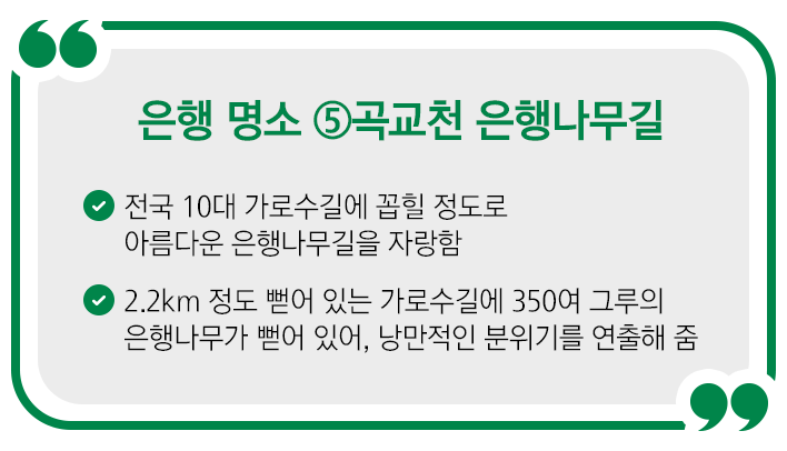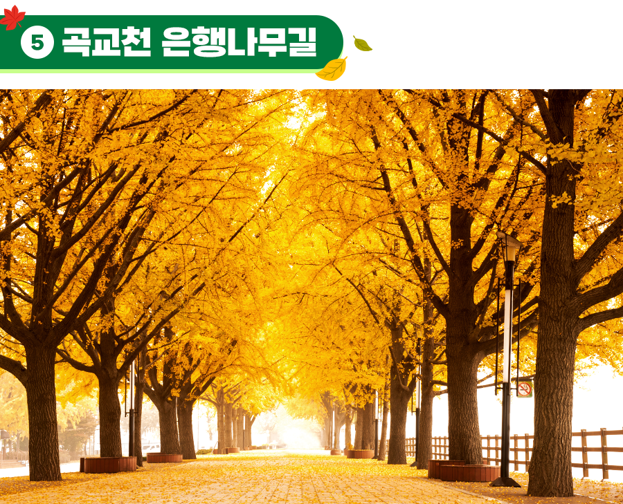 단풍만큼이나 가을에만 볼 수 있는 은행나무 명소도 알려드릴게요! 충남 아산에 위치한 곡교천은 전국 10대 가로수길에 꼽힐 만큼 아름다운 은행나무 길을 자랑합니다. 가을이 되면, 일제히 노란 빛을 내는 이곳은 350여 그루의 은행나무가 2.2km 정도 나란히 뻗어 있어 낭만적인 분위기를 선사해 줍니다.