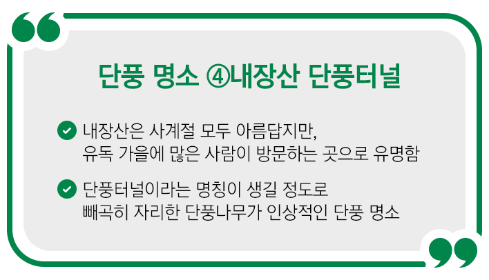 전북 정읍에 위치한 내장산(內藏山)은 ‘산 안에 숨겨진 것들이 무궁무진하다.’는 의미가 담겨 있습니다. 그 정도로 사계절 내내 아름다운 모습을 자랑해요! 특히 가을의 내장산은 다른 계절보다 더 빛을 발한다고 합니다. 이유는 단풍나무 덕분인데요! 빼곡히 자리한 단풍나무로 인해 내장산의 가을은 울긋불긋 물들어 있답니다.