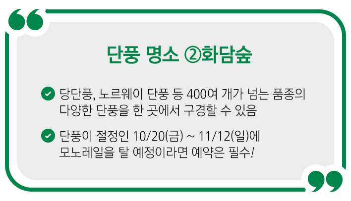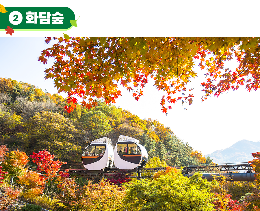 이곳의 단풍 종류로는 당단풍, 털단풍, 노르웨이단풍, 내장단풍 등 400여 개가 넘는 품종의 단풍이 골고루 존재하는데요. 그래서 같은 듯 다른 느낌의 다양한 단풍을 한눈에 담을 수 있습니다. 또한, 화담숲에 갔다면 반드시 타야 할 모노레일! 5분 간격으로 운행하는 모노레일은 단풍 숲을 통과해 지나가는데요. 알록달록한 단풍을 나무 위에서 조망할 수 있으니, 화담숲에 갈 예정이라면 모노레일은 꼭 도전해 보세요. 현재 화담숲에선 단풍 시즌인 10/20(금) ~ 11/12(일)까지 모노레일 예약 판매를 하고 있다고 하니 가시기 전 필히 선 예매 후 방문하시길 바랄게요!
