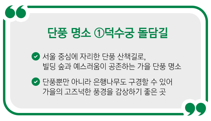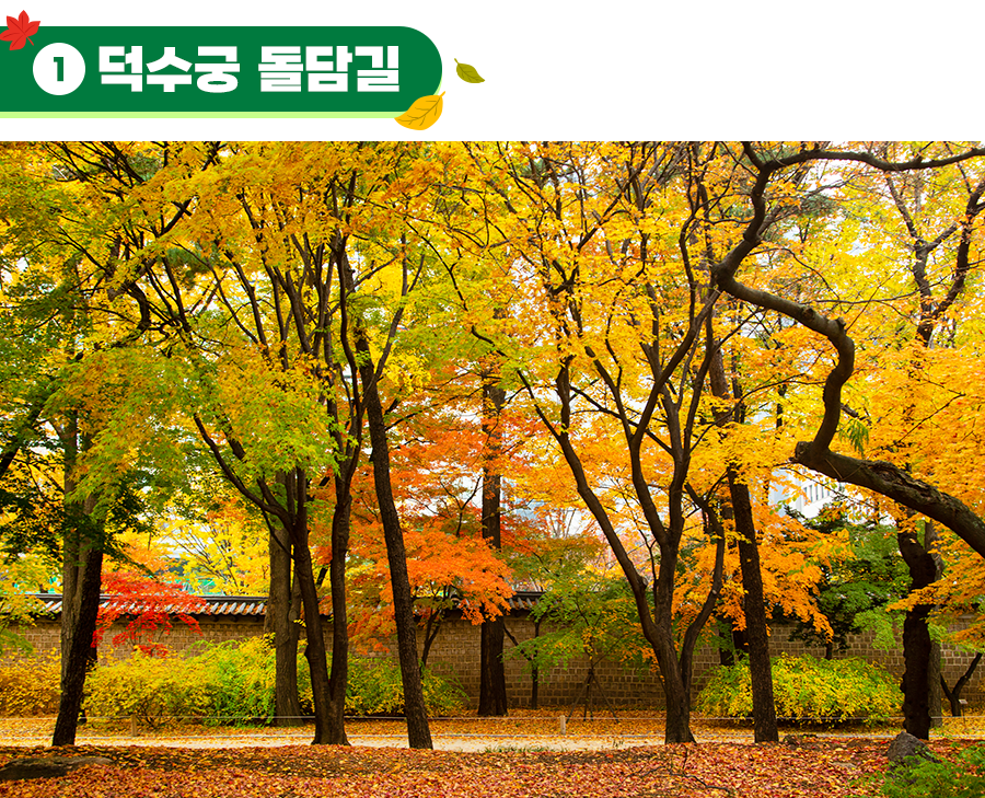 덕수궁 돌담길은 가을에 아름다움이 빛을 발하는 장소예요. 이유는 우거진 단풍나무와 은행나무 때문인데요! 돌담 아래로 핀 단풍잎과 은행잎은 가을을 있는 그대로 보여줍니다. 알록달록하면서도 고즈넉한 풍경 덕분에 가을 단풍 길로도 유명하죠. 한적한 서울 단풍 나들이를 떠나고 싶다면, 덕수궁 돌담길로 오시는 걸 추천해 드려요:-)