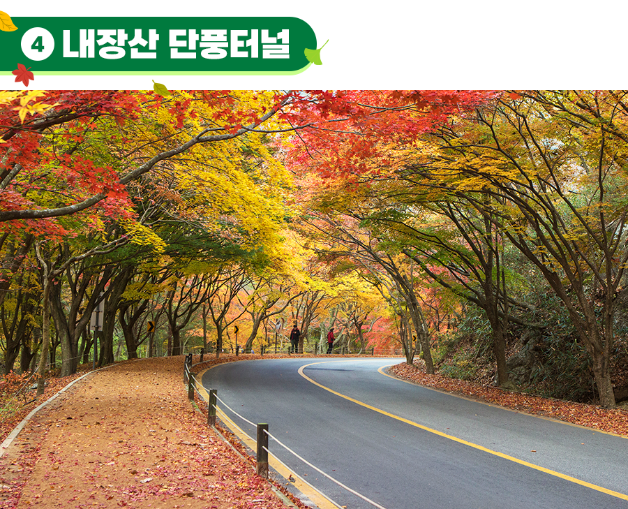 내장산 단풍 터널은 우거진 단풍나무 때문에 붙은 명칭인데요. 곳곳에 자리한 단풍나무가 가지마다 길게 뻗치면서 수많은 단풍잎이 마치 터널처럼 온 길을 덮고 있죠. 단풍 터널을 보러 가기 위해선 입구에서 케이블카를 타거나 30분 정도 걸어가야 만날 수 있다고 해요. 가까운 거리는 아니지만 그렇다고 먼 거리도 아니죠:D 하지만 가는 길이 모두 단풍나무가 심겨 있어, 가을을 만끽하며 갈 수 있다고 합니다. 맑은 산 공기도 마시고 빨간 단풍도 구경하고 싶다면, 단풍 개화 시기에 맞춰 내장산을 방문해 보세요!