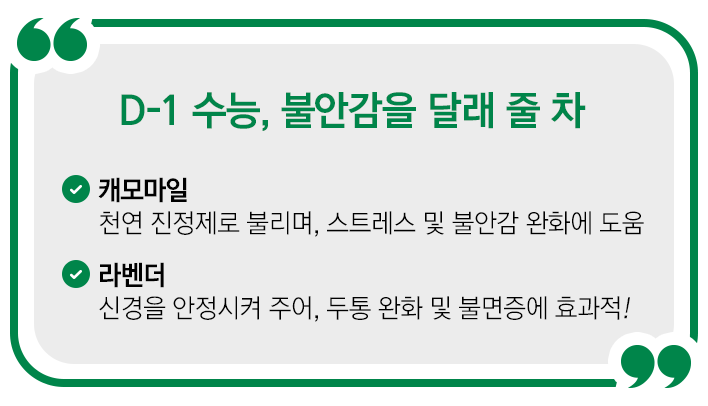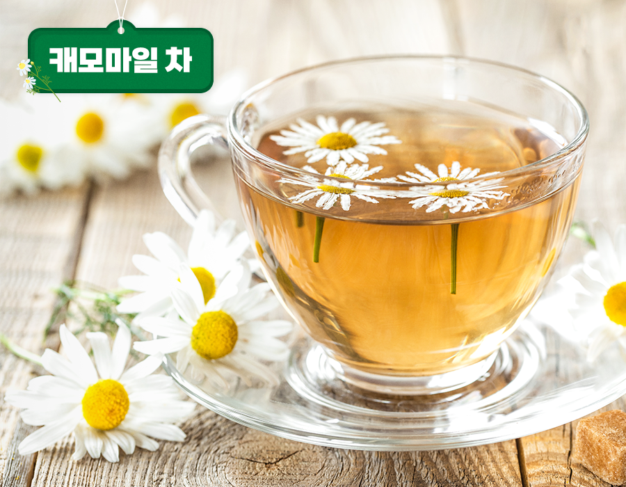 캐모마일은 천연 진정제라 불릴 만큼 마음을 편안하게 해주는 차입니다. 스트레스 감소와 불안감 완화에 도움을 주고, 불면증을 겪는 사람에게도 추천합니다. 이뿐만 아니라, 소화 촉진과 노폐물 제거에도 효과적이고, 카페인도 포함돼 있지 않아 수능에 대한 압박으로 힘들어하는 수험생이 마시면 좋겠네요.