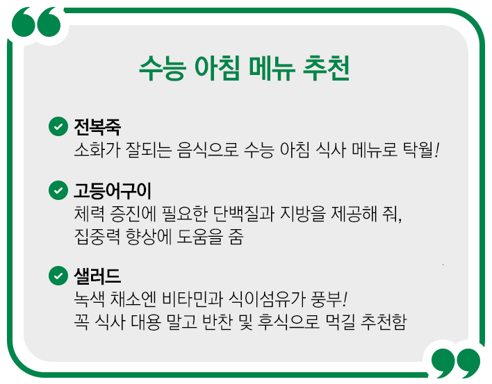 단 하루 만에 그간 노력했던 모든 것을 쏟아부어야 하는 수능은 극도의 긴장감을 불러일으킵니다. 특히 수능 당일엔 소화가 되지 않을까 봐 아침을 거르려는 수험생들 있을 텐데요. 아침 식사는 오전 시험을 치를 때 집중력을 높여주고, 학습 효율도 상승시켜 주는 효과가 있습니다. 그러니 수능 당일엔 꼭 아침을 먹고 시험장으로 향하는 게 좋죠.