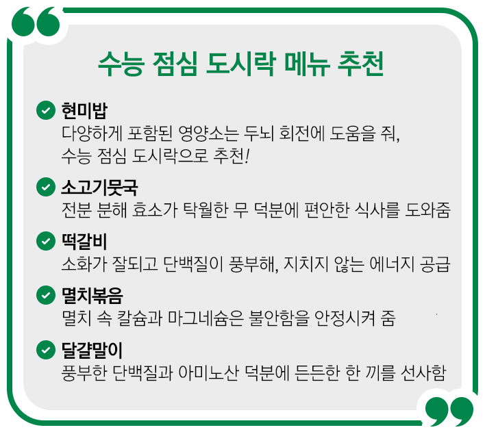 수능 시험장에 갈 때 수험표만큼 중요한 게 있죠. 바로 도시락입니다! 1, 2교시 시험이 끝나고 점심을 먹은 후 또 시험을 치러야 하므로 밥심이 정말 중요한데요.