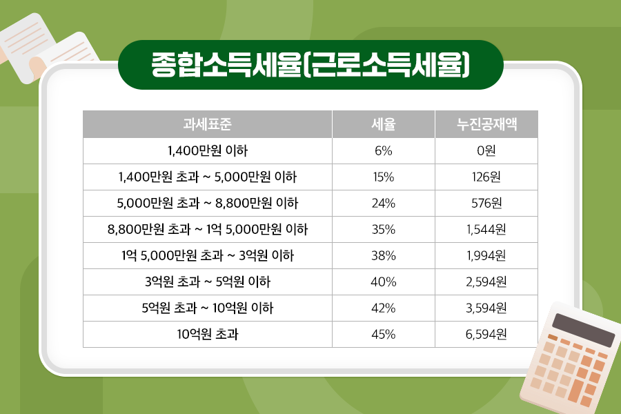 연말정산이 어떻게 책정되는지 알아보기 위해 소득공제, 세액공제 두 가지를 먼저 알려드리겠습니다. 소득공제는 ‘나의 근로소득금액에서 공제가 된다’고 해서 소득공제인데요. 표에서 보시는 바와 같이 아직 세율이 곱해지기 전 단계이기에 높은 소득세율(6~45% 누진세율 구조)을 적용받는 분들일수록 소득공제 항목에 신경을 쓰시면 절세효과가 좋습니다. 예를 들면, 200만 원의 소득공제가 6% 세율을 적용받는 사람 A와 35% 세율을 적용받는 사람 B 중 누구에게 절세효과가 클까요? 정답은 당연히 B입니다. A는 200만 원의 6%인 12만 원만큼 절세가 되는 반면, B는 200만 원의 35%인 70만 원만큼 세금이 줄어들기 때문입니다.