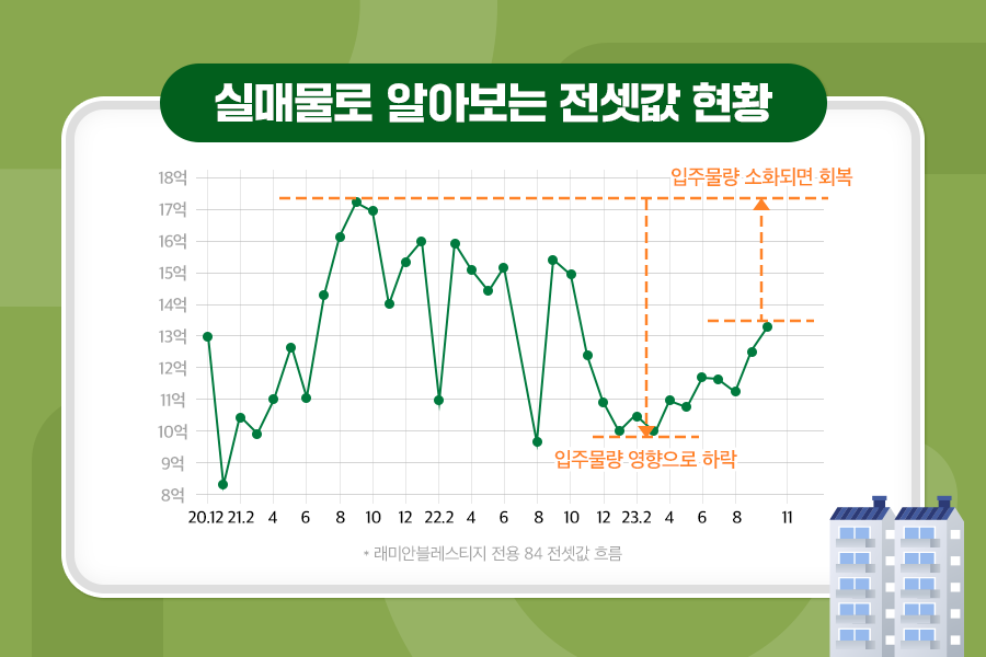 위 그래프는 개포지구에 위치한 개포주공2단지를 재건축한 래미안블레스티지 전용 84 전셋값 흐름으로, 개포자이프레지던스 입주장이 시작되기 전 17억 원 이상 형성되었던 전셋값이 입주 물량이 쏟아지면서 10억 원까지 떨어졌다가 최근 13억 원 수준까지 회복한 것을 알 수 있습니다. 8월 반포 원베일리 2,990세대 입주 영향도 있었고, 11월 입주 예정인 개포 디에이치퍼스티어아이파크 입주 물량 영향으로 아직은 13억 원 수준에 머무르고 있지만, 내년 상반기 개포지구에 입주장이 사실상 마무리가 되면 다시 예전 수준인 17억 원까지 올라갈 가능성이 높습니다.