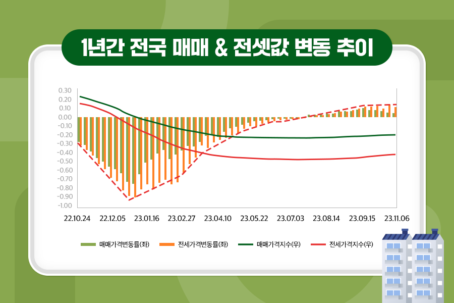 위 그림은 2022년 10월부터 올 11월 초까지 약 1년간 전국 매매 및 전셋값 변동률 추이를 보여줍니다. 그래프를 보면 아시겠지만, 2022년 매맷값과 전셋값이 가파르게 하락했다가 올해 1월이 되면서 점차 반등하는 모습을 볼 수 있습니다. 이때 유심히 봐야 할 것이 매맷값보다 전셋값의 변동 폭이 더 크다는 걸 알 수 있죠. 그럼 이렇게 전셋값의 차이가 큰 이유는 무엇일까요? 이를 알기 위해선 2022년 전셋값이 떨어진 이유부터 알아봐야 합니다.