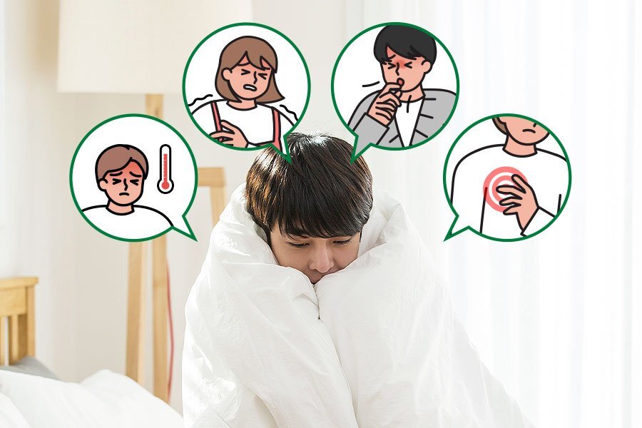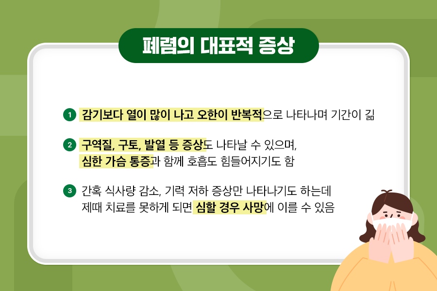 폐 속에는 약 3~5억 개의 허파꽈리가 있는데요. 우리가 숨을 들이마실 때 공기와 혈액 간에 산소와 이산화탄소 교환이 이루어질 수 있도록 도와줍니다. 그런데 폐렴에 걸리면 이 허파꽈리에 고름과 체액이 차서 숨 쉬는 것이 고통스러워집니다. 이로 인해 산소 흡입 또한 힘들어질 수 있고요. 이외에도 구역질, 구토, 설사, 근육통, 피로감, 발열, 두통, 관절통 등의 증상들이 나타날 수 있습니다.