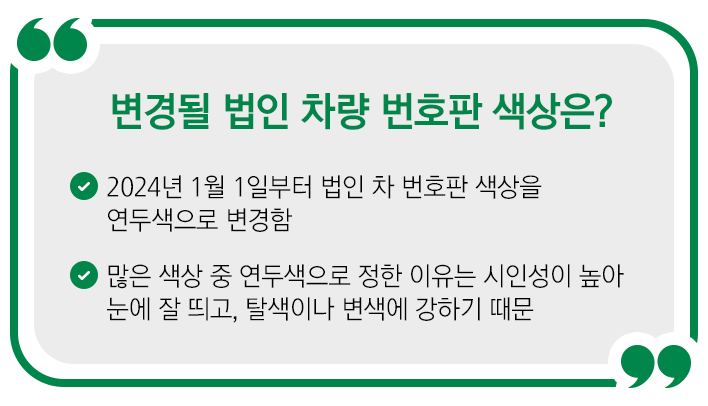 이를 보면 알 수 있듯 번호판만으로도 차량의 용도와 차종을 알 수 있습니다. 하지만 법인 차량은 전혀 알 길이 없는데요. 이를 개선하고자 국토교통부에선 내년부터 법인 차량의 번호판 색깔을 연두색으로 변경합니다. 2024년 1월 1일부터 바로 적용할 예정인데요. 그렇다면 많은 색상 중 연두색으로 지정한 이유는 무엇일까요?