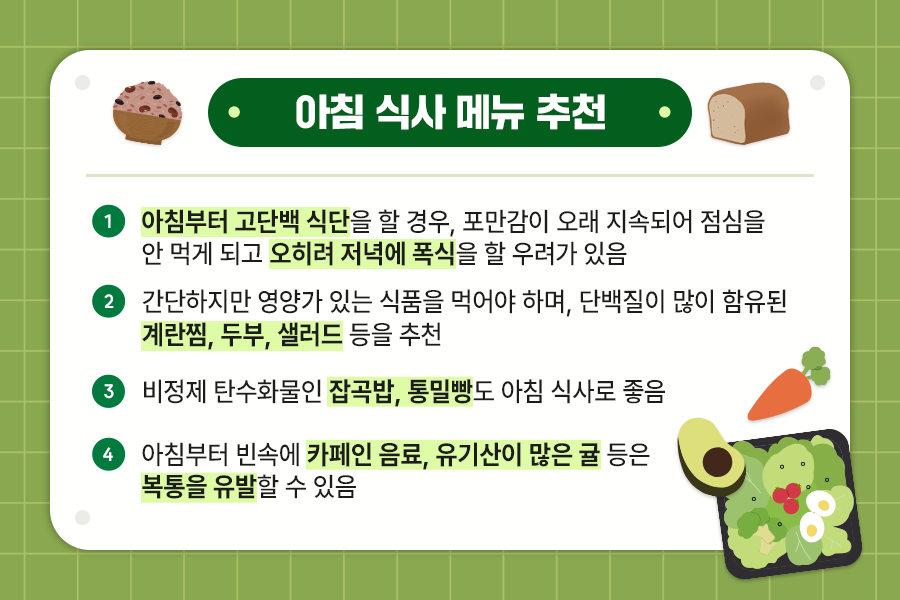 흔히 ‘아침은 왕처럼, 점심은 왕자처럼, 저녁은 거지처럼’ 먹어야 한다고 이야기합니다. 그러나 바쁜 아침 시간에 왕이 될 여유는 없습니다. 아침마다 밥, 국, 반찬 등을 조리해 먹기 어렵다면 필요한 영양소가 들어있는 식품으로 간단하게 먹는 것을 권합니다. 중요한 것은 영양소를 적절히 보충하고 공복감을 해결하는 것입니다. 고단백 식품을 먹으면 호르몬 영향으로 식욕이 감소하고 포만감이 오래갈 수 있습니다. 계란찜, 두부 요리, 샐러드 등을 추천하며, 이마저 부담된다면 삶은 달걀 1~2개, 단백질 음료 한 잔, 저지방 요거트 등을 챙겨 먹는 습관을 갖는 것이 좋습니다. 탄수화물은 비정제 탄수화물인 잡곡밥 또는 통밀빵을 드시기를 추천합니다. 반면 단순당 함량이 높은 음식은 쉽게 포만감이 사라지고 칼로리가 높으며, 과식을 유발할 수 있으므로 피해야 합니다. 자극적이고 짠 음식 역시 당연히 좋지 않습니다. 그리고 빈속에는 유기산이 많은 귤, 오렌지 등과 카페인이 많은 커피, 홍차 등은 피하는 것이 좋겠습니다.
