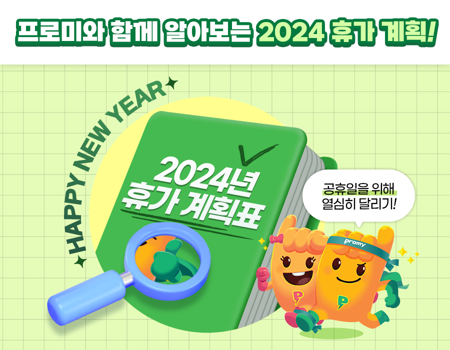 매년 새해가 밝으면 가장 먼저 확인하는 게 있죠. 바로 올해의 공휴일 개수인데요:) 올해는 작년보다 공휴일 수가 늘었을까요? 줄었을까요? 또, 2024년 휴일에 맞춰 휴가 계획은 어떻게 짜면 좋을지! 프로미와 함께 올해 휴일 일정부터 차근차근 알아보도록 해요.