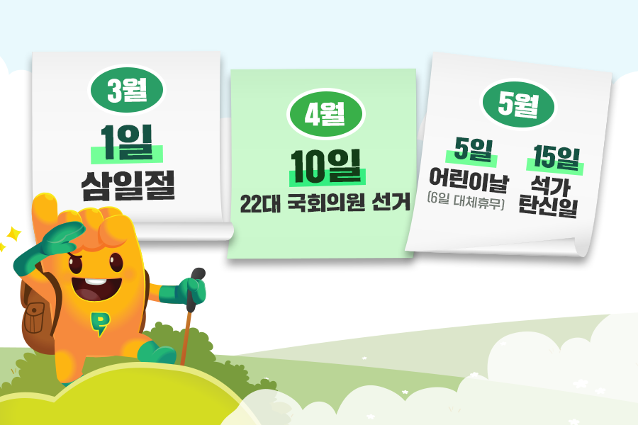 4월은 본래 공휴일이 일절 없는 달이죠. 개인적으로 연차를 쓰지 않으면 평일에 쉴 수 있는 날이 없는데요. 하지만 올해는 4월 10일(수)에 국회의원 선거가 있습니다. 한 달 중 거의 중간에 껴 있어 피곤함을 덜어줄 것 같죠.