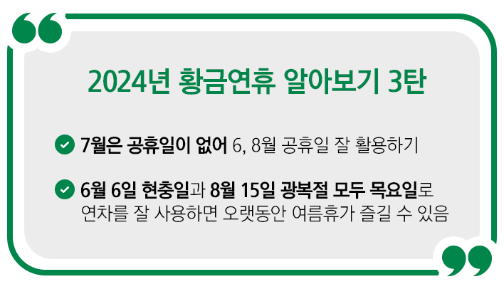 6월부터 8월까진 여름휴가의 달이기도 하죠. 가족, 친구와 함께 어디든 떠나고 싶은 달일 텐데요. 이때도 공휴일을 잘 활용하면 여름휴가를 오랫동안 만끽할 수 있답니다!