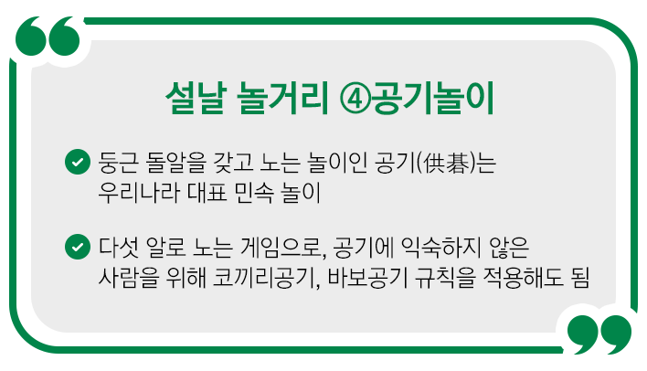 공기는 혼자서도 충분히 할 수 있는 놀인데요. 그래도 여럿이서 함께 하는 게 더 재미있겠죠? 공기놀이는 다섯 알을 갖고 한 알씩, 둘 알씩, 세 알씩, 네 알씩 잡기 그리고 마지막엔 꺾기로 점수를 매기는 게임입니다. 이론상 쉬워 보이지만, 처음 하는 사람에겐 살짝 어려울 수도 있어요. 그래서 공기에 미숙한 사람을 위해 ‘코끼리공기’, ‘바보공기’와 같은 규칙도 있답니다:) 실내에서도 편하게 할 수 있으므로, 온 가족과 함께하기 좋은 설날 놀거리겠네요.