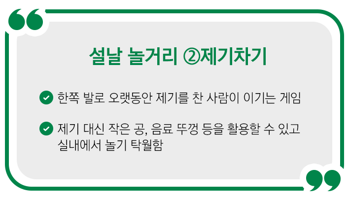 제기차기는 한국 민속놀이입니다. 설날에 주로 하던 놀이로, 한쪽 발로 제기를 차며 떨어뜨리지 않고 최대한 오래 찬 사람이 이기는 게임인데요. 제기만 있다면 실내에서도 할 수 있고요. 제기 대신 작은 공, 음료 뚜껑 등을 활용할 수 있어, 설날에 가족과 함께 즐기기 좋은 놀거리죠.