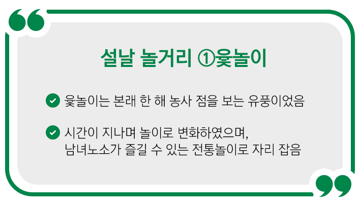 윷놀이는 본래 놀이가 아닌 한 해의 농사 점을 보는 고대 농경시대의 풍습이었다고 합니다! 도, 개, 걸, 윷, 모는 각각 돼지, 개, 양, 소, 말 동물을 뜻하며, 한 해가 시작하면 윷을 던져 올해 농사의 풍년과 흉년을 점쳤다고 하죠. 오랜 세월이 지나면서 본래의 뜻은 점차 사라지고, 지금의 놀이가 되었는데요. 윷놀이의 유풍은 사라졌지만, 온 가족이 함께 모여 즐거움을 느낄 수 있도록 설날 놀거리로서 역할을 톡톡히 해주고 있답니다. 이번 설날엔 윷놀이의 의미를 되새기며, 가족들과 함께 즐거운 시간을 가져보는 건 어떨까요?!