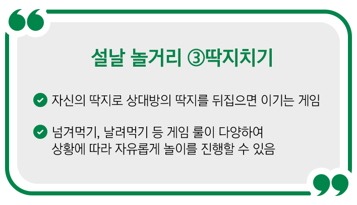 딱지치기 게임 룰도 다양합니다. 앞서 말씀드린 상대의 딱지를 넘겨 이기는 ‘넘겨먹기’ 방식이 있고요. 한 손으로 딱지를 잡고 앞으로 날려 더 멀리 날아간 사람이 이기는 ‘날려먹기’, 벽에 딱지를 때려 더 멀리 튕겨 내보내는 ‘벽치기’, 땅에 원을 그려놓고 상대 딱지를 원 밖으로 밀어내는 ‘밀어내기’가 있습니다. 딱지 하나를 갖고 다양하게 놀 수 있어, 이번 설날에 가족과 함께 딱지치기 게임을 하면 정말 재미있겠네요!