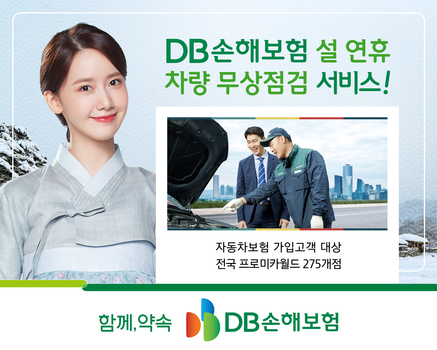 DB손해보험은 2024년 갑진년 설명절을 맞아 오는 2월5일부터 8일까지 연휴 전 사고예방과 고객만족도 제고를 위해 차량 무상점검서비스를 진행합니다.